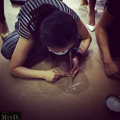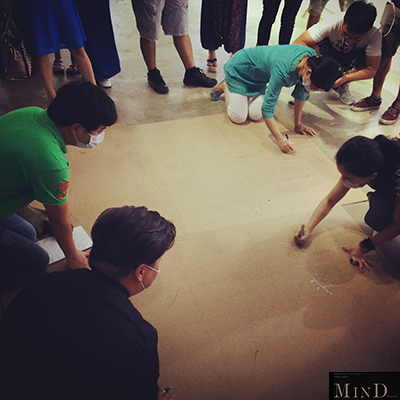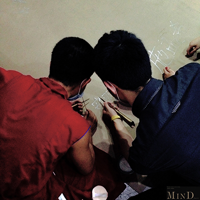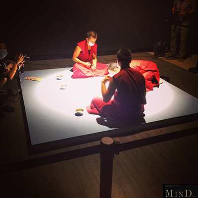 各位青年朋友們也和畫師一同盤腿跪下,匍匐著嘗試體驗一場頗具宗教苦行意味的創作。參悟和繪畫同時進行,身軀酸痛和心靈釋放也在同一刻。體驗活動的最後是創作者親手掃去沙礫,霎那間我們似乎提前預覽了兩個月以後會在這裡完成的終結儀式,竟比誕生之時還要隆重。悵然若失的圍觀者們不知是否參透了曼陀羅,所象徵的那種緣起緣滅:“萬物皆隨各種條件和合而存在,又隨各種條件因緣離散而消亡。”。