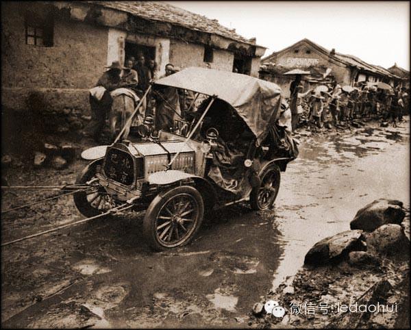 北京至巴黎汽車拉力賽汽車行駛在中國泥濘的土路上1907
