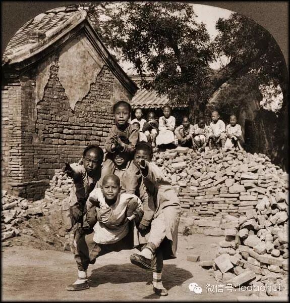 流浪孩子組成的雜耍班在表演龍頭的造型北京1902