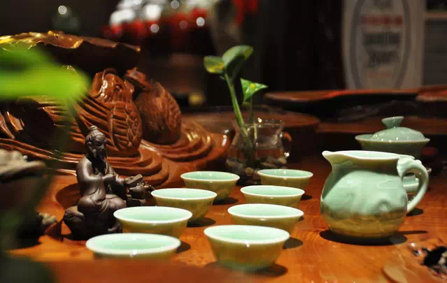 (八)、掀起鄉土文化熱潮。因為茶藝的推動而使得尋根的風氣崛起,鄉土的文學、歌曲、服飾重為時尚,譬如說:我穿的衣服,好像學茶的人都穿這種衣服似的,其實也不是,我以前也都穿西裝的,只是現在比較忙碌,穿這種的比較簡單,又不必打領帶;所以,並不是說學茶藝的人就要穿這種鄉土的服飾、民族的服飾。可是呢,也可以說這樣比較搭調;因為這種服飾也是因茶藝的興起而流行起來的。現在學茶的人,大部分也都是穿這種中式的衣服了,更特別的是學茶的人也開始留鬍子,我不知道是不是受了我的影響,我是1987年才開始留鬍子的。我看現在很多茶藝館的老闆,有鬍子,沒鬍子都要留一點,這也是因為某一種東西而帶來的另一種東西的現象;還有收藏老傢俱、老古董,成為茶具或茶藝館的風景,以前那些東西要丟都沒有人要,現在被人家搶著高價收購,連農村用的蓑衣、笠冒都被人家搶購了,收藏這些老家具、老古董,成為搭配茶藝的一項風氣。