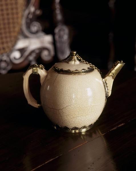 55. 薩里漢姆莊園,有一個標誌性古老的中國茶壺(1650-1670)。,始終在公爵夫人的私人房間的茶几上。這只中國漳州白瓷茶壺(歐洲鍍銀支架)。