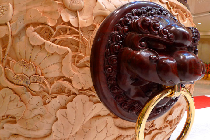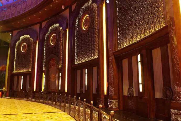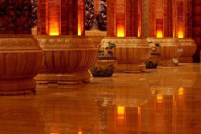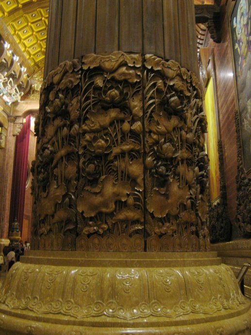 由這些合抱粗的巨型廊柱就可以看出梵宮規模之宏大,廊柱底部這些圖案均採用東陽木雕透雕工藝。