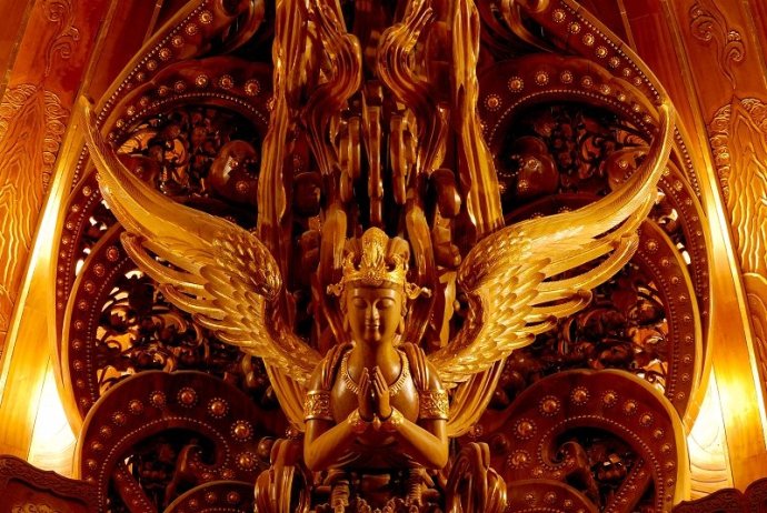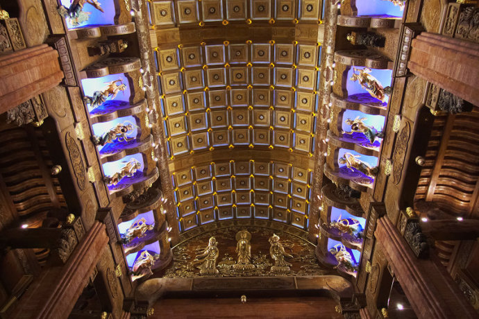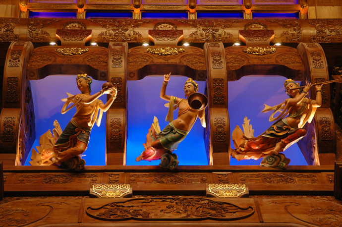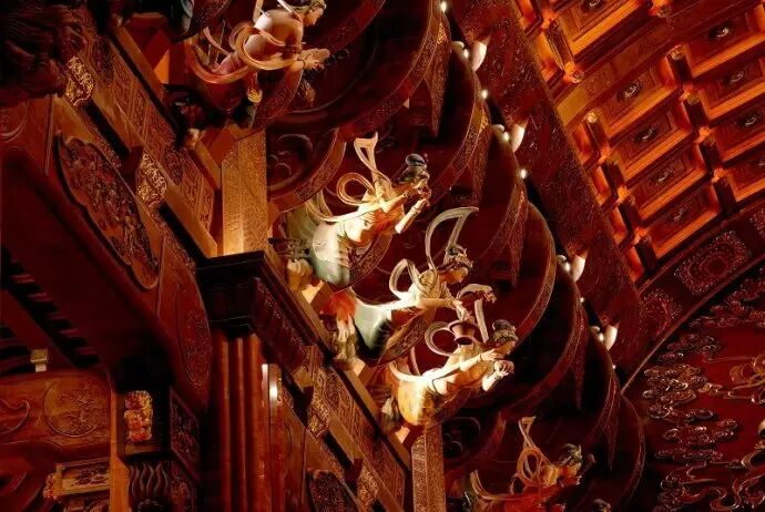 廊廳頂部藻井兩側為12組32座仕女飛天雕像,這些採用千年技法“生漆脫胎”工藝打造的飛天造型,容貌秀麗,體態豐盈、飛袖飄逸,或彈琵琶、或吹簫,或捧香花,栩栩如生似攜彩雲飛之欲出,讓人如臨仙境。