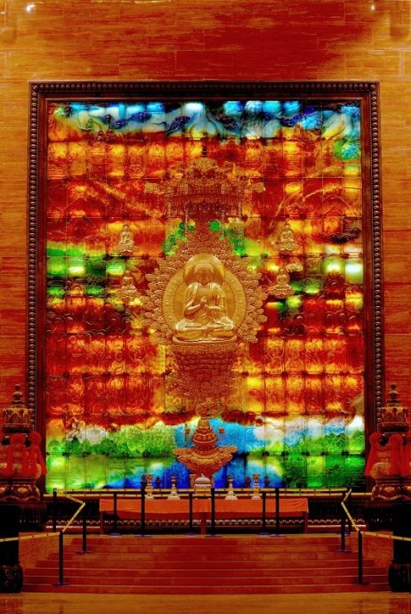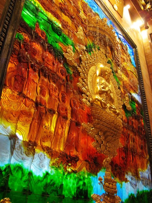 這幅巨型琉璃壁畫,由160塊1米×0.5米的琉璃構件組成,總寬8米,高10米,外部鑲嵌一個青銅邊框。共用去了15公斤黃金、500多公斤白銀,和12.8萬顆翡翠、珊瑚、瑪瑙等佛教“七寶”聖物。