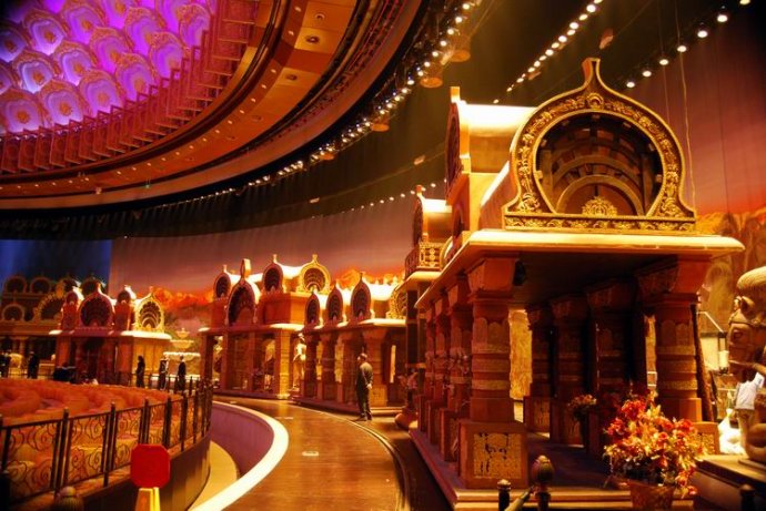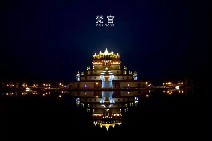 這是梵宮對面的五印壇城,五印”是指佛的五種手印,即施無畏印、與願印、說法印、觸地印和禪定印,也稱“釋迦五印”。壇城梵文叫作曼荼羅,有會聚之義,是供奉佛菩薩並在此修行的場所。五印壇城,佔地面積約5000平方米,高度31.55米,共計六層,是由藏族能工巧匠嚴格按照傳統工藝建造的藏傳佛教風格建築。
