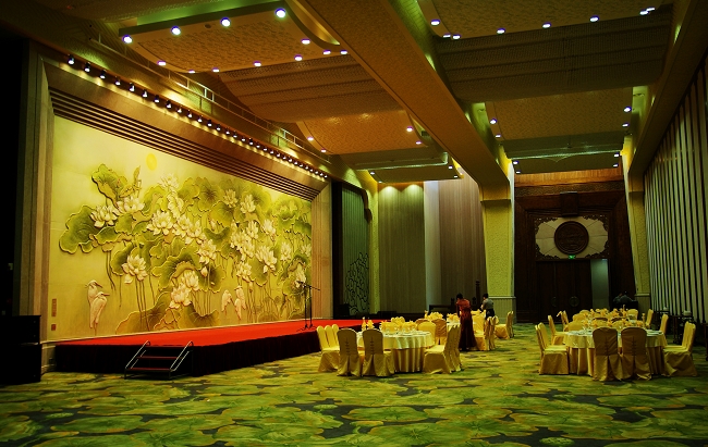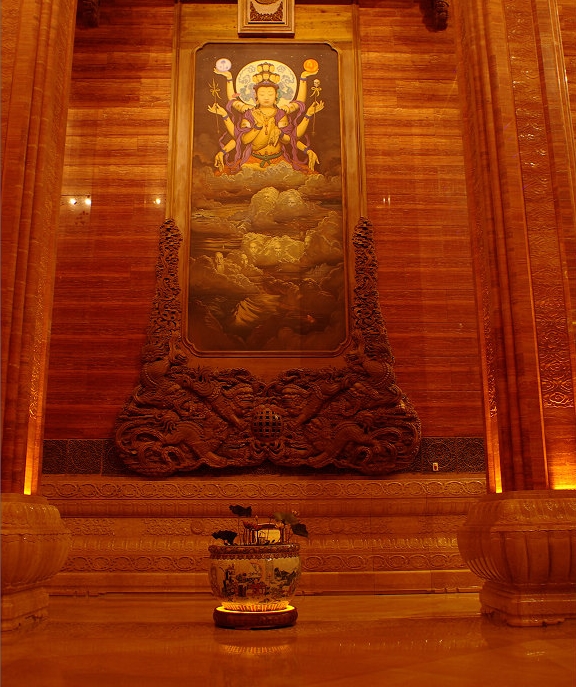 塔廳為八角形,四周牆面飾有四幅巨型木雕作品,分別以“靜、信、孝、和”命名,形像地展示佛教信仰的精神內涵。每幅木雕作品高7.39米、寬4.3米。