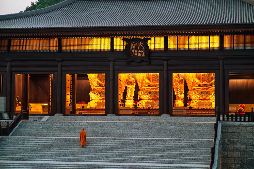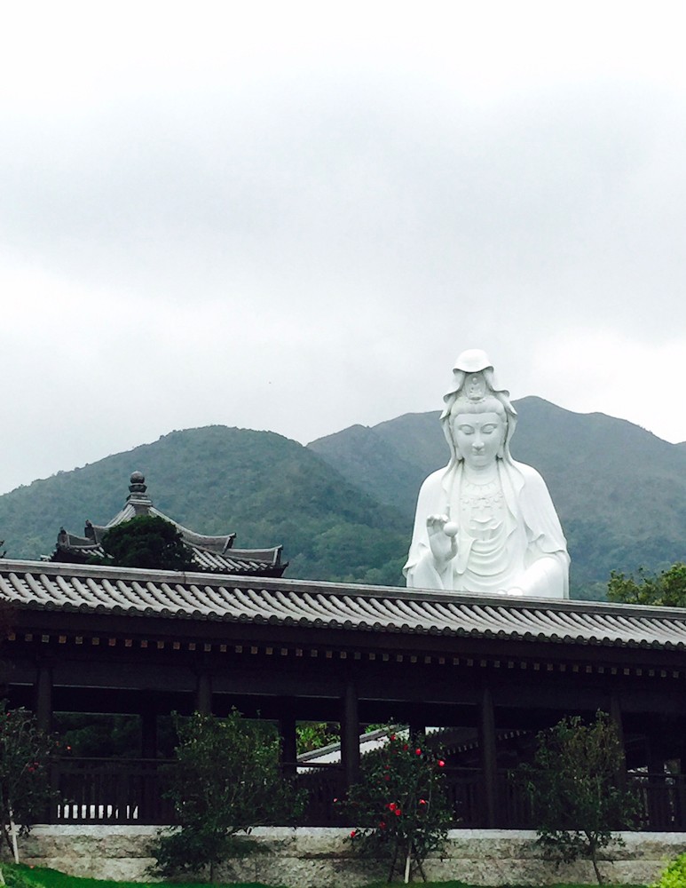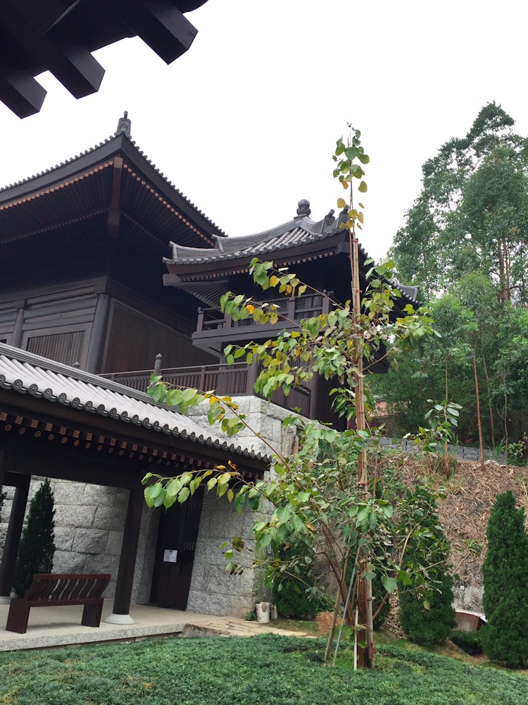 李嘉誠十幾年前用7000多萬向政府買下這幅地皮,耗了10年才把這仿唐風的佛寺建成。據說用料十分講究,木材採用非洲進口的紫檀木,大雄寶殿三尊佛像的蓮花狀寶蓋鍍24K金,屋頂則採用日本燒造銀瓦,傳統外貌結合現代化設備。
