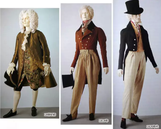 - 巴洛克時期:長卷雞毛撣假髮、華麗排扣長外套、燈籠褲