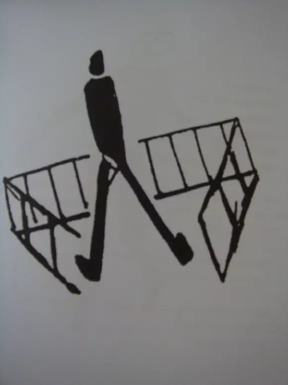在《三個奔跑的人》中,卡夫卡畫了三個形態各異的人,線條格外抽象洗練,又不失流暢的動感,立意取自創作於1912年的作品《失踪的人》; 《給密倫娜•耶森斯卡的一封信》中他描寫了一個“犯罪者”雙手如何被固定在兩根棍子上,而發明這個捆綁法的那個人靠在柱子上,一幅不可一世的樣子,卡夫卡說這種捆綁法跟屠夫捆綁掏空內臟的豬別無兩樣,因此,畫作《說說我的工作》類似於說明圖,更像是對於這個怪誕場景的解析。