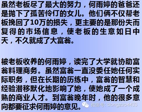 20年前,浙江一個老闆的妻子,在一個晚上,把自己的錢包丟在醫院裡。老闆焦急萬分,連夜去找。因為錢包裡不僅有10萬現金,還有一份十分機密的市場信息。當老闆趕到那家醫院時,他一眼就看到,清冷的醫院走廊裡,靠牆根蹲著一個凍得瑟瑟發抖的瘦弱女孩,在她懷中緊緊抱著的正是妻子丟的那個錢包。原來,這個女孩叫何雨婷,是來這家醫院陪病重的爸爸治病的。相依為命的父女倆家裡很窮,賣了所有能賣的東西,湊來的錢還是僅夠一個晚上的醫藥費。沒有錢明天就得被趕出醫院。晚上,無能為力的何雨婷在醫院走廊裡徘徊,她天真的朝其他人跪拜,希望能碰上一個好心人救救她爸爸。突然,一個從樓上下來的女人經過走廊時腋下的一個錢包掉在地上,可能是她腋下還有別的東西,錢包掉了竟毫無知覺。當時走廊裡只有何雨婷一個人,她走過去撿起皮包,急忙追出門外,那位女士卻上了一輛轎車揚長而去了。何雨婷回到病房,當她打開那個錢包時,父母倆都被裡面成沓的鈔票驚呆了。那一刻,她心裡都明白,用這些錢可能治好爸爸的病。爸爸卻讓何雨婷把錢包送回走廊去,等錢包的人回來取。爸爸說:“ 丟錢的人一定很著急。人的一生最該做的就是幫助別人,急他人所急;最不該做的是貪圖不義之財,見財忘義。”富翁臨危之際,留下一分令人驚奇的遺囑:在我認識何雨婷父女之前我就已經很有錢了。可當我站在貧病交加卻拾巨款而不昧的父女面前時,我發現他們最富有,因為他們恪守著至高無上的人生準則,這正是我作為商人最缺少的。我的錢幾乎都是爾虞我詐、明爭暗鬥得來的。是他們使我領悟到了人生最大的資本是品行。我收養何雨婷既不是為知恩圖報,也不是出於同情。而是請了一個做人的楷模。有她在我的身邊,生意場上我會時刻銘記,哪些該做,哪些不該做,什麼錢該賺,什麼錢不該賺。這就是我後來的業績興旺發達的根本原因,我成了億萬富翁。我死後,我的億萬資產全部留給何雨婷繼承。這不是饋贈,而是為了我的事業能更加輝煌昌盛,我深信,我聰明的兒子能夠理解爸爸的良苦用心。富翁在國外的兒子回來時,仔細看完父親的遺囑,立刻毫不猶豫的在財產繼承協議書上簽了字:我同意何雨婷繼承父親的全部資產。隻請求何雨婷能做我的妻子。何雨婷看完富翁兒子的簽字,略一沉吟,也提筆簽了字:我接受先輩留下的全部財產——包括他的兒子。看完了,你從中領悟到了那個樸實的道理了嗎?如果你對人冷淡,別人也會回以冷漠;如果你經常批評別人,你也會接收到許多的批評;如果你總是擺一張臭臉,沒錯,別人也不會給你好臉色。所有你所給予的,都會回到你身上。只要你一直善良下去,你就贏了,套句詩人的話:“人受惡意之作弄,必作惡以回報。”