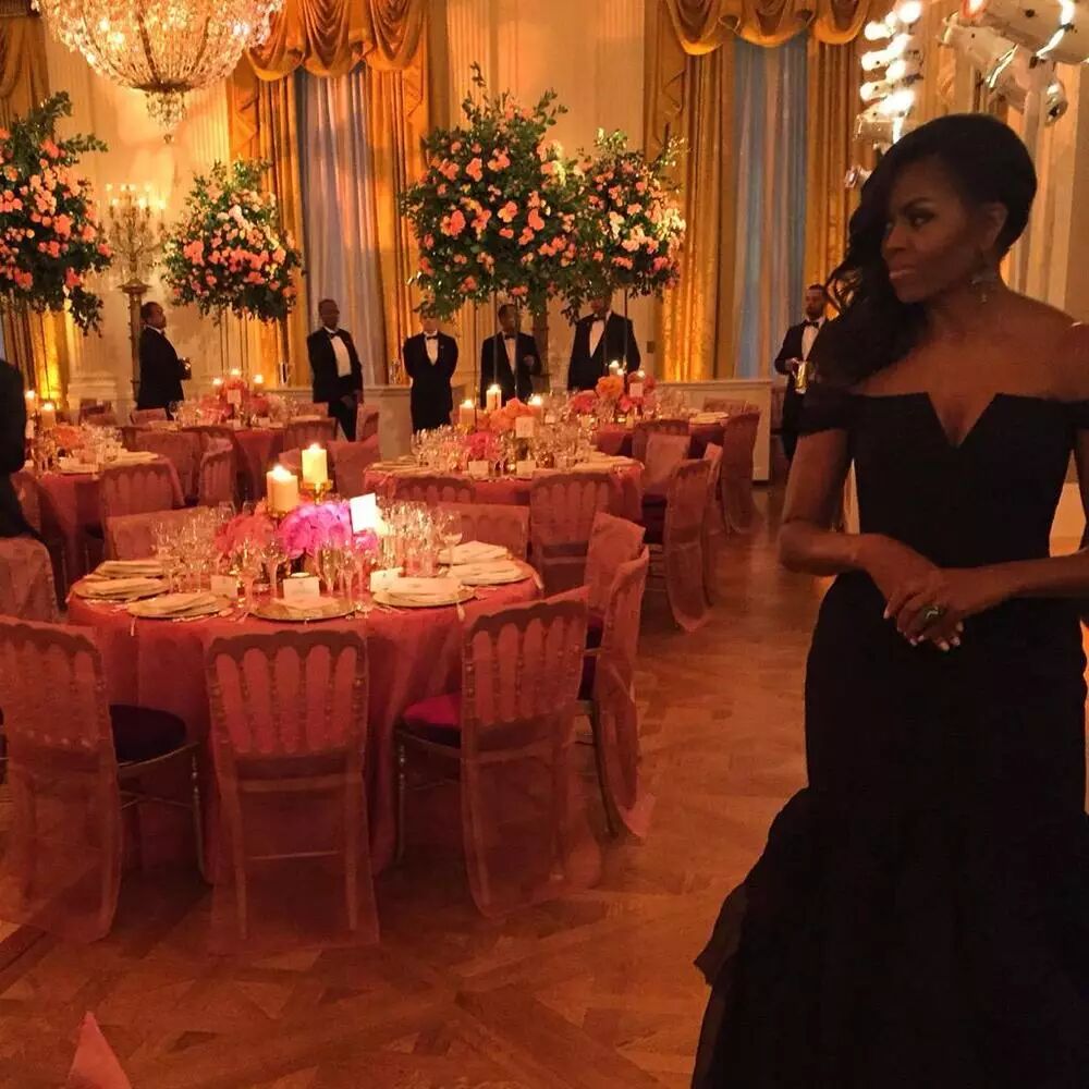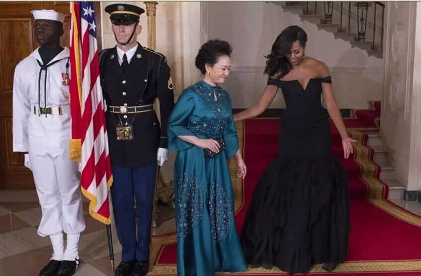 米歇爾引領彭麗媛進入宴會廳。彭麻麻高貴婉約,米歇爾性感優雅。牡丹玫瑰競爭艷!