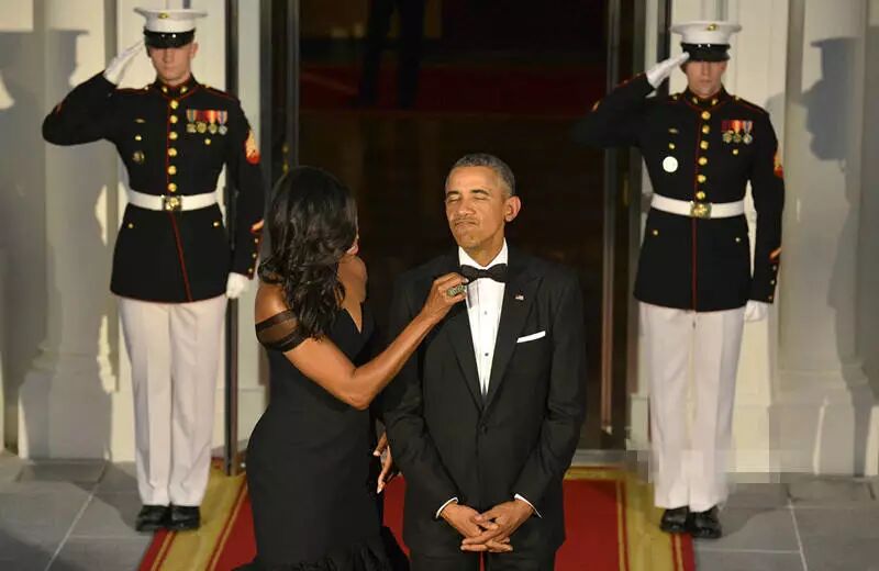 鏡頭先回放一下。在等候習主席和夫人時,為亮出最佳形象,米歇爾為毆巴馬整理領結充滿溫馨,國宴瞬間切換到偶像劇,我也是醉了。