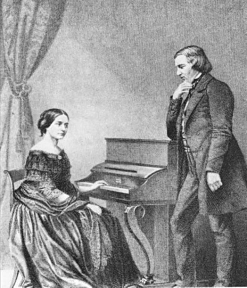羅伯特·舒曼與克拉拉的姻緣佳話流傳甚廣,二人伉儷情深,也是音樂事業上的好夥伴。1829年,德國作曲家、評論家舒曼拜在克拉拉的父親維克(F.Wieck)麾下學習鋼琴,二人因此結緣。