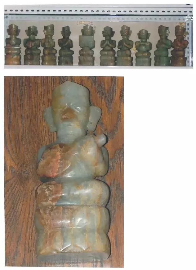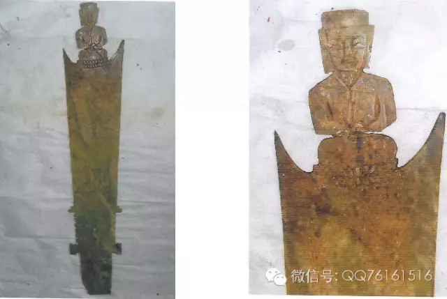 二、佛像、佛頭實物 現已發現,在廣漢古蜀國佛像的載體有玉牙璋、玉璧、象牙、牛胛骨上等等。此外,在古蜀國還發現了玉巫師人,巫師是道教做法事的人,他 的服飾與佛教完全不同,在古蜀國除了佛教以外,可能還有道教存在,道、佛二教在古時可能是合一的,它們都起源於巫教,而後隨時間推移,信仰有些差異而分道揚鑣。有學者認為,西藏的苯教可能與內地的古羌釋比文化有關係,苯教是西藏本土的一種原始宗教,早於吐蕃時期“傳入”西藏的佛教存在於西藏本土之中,在苯教中存在有古羌族釋比文化的因素。(上圖為