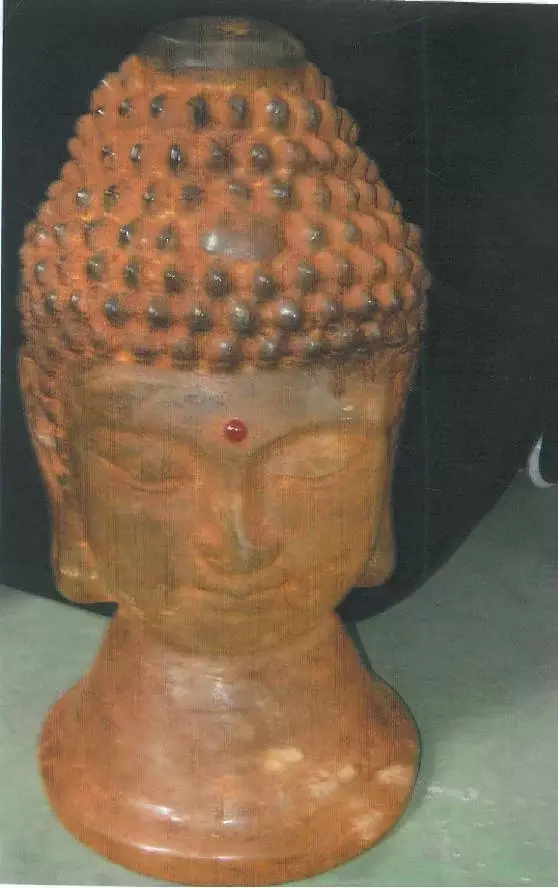 這是一尊重 22.91kg ,高 48cm 的水晶佛像,額頭上嵌上(粘上)有一顆直徑 1.2cm 的紅色寶石)