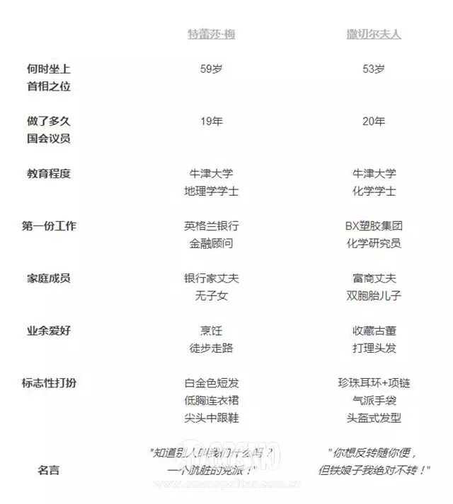 儘管Theresa自稱沒有政治偶像,但媒體喜歡拿她與撒切爾夫人對比。畢竟,她是繼撒切爾夫人之後第二位女首相。她們不僅都有一樣乾淨利落的外形,牛津大學的學歷,還有相似的傳教士家庭背景和強硬的政治作風。