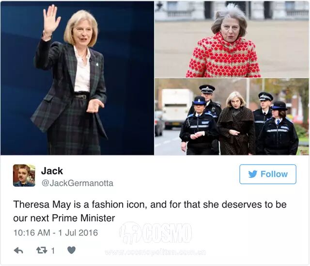 在普通政府要員一水兒的黑白灰中,梅姨的衣品顯得尤為與眾不同,為她拉攏了不少追隨者。甚至有時裝博客勤懇地記錄分析著她的每一次亮相,不少網友也在首相人選公佈前就早早站隊:“就衣服來看必須投給特里莎·梅”、“特里莎·梅是時裝偶像,因此她就應該當首相”。