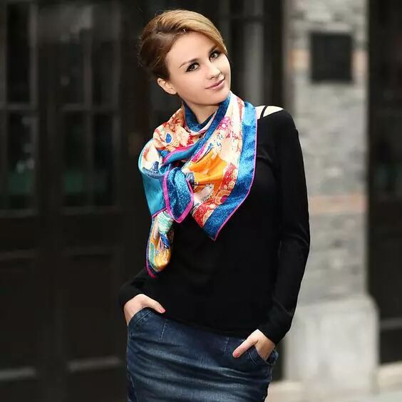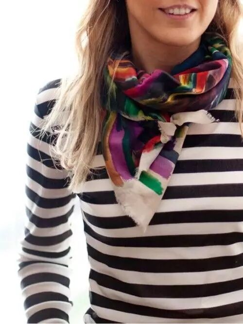 大膽新奇的大幅絲巾,亮麗的顏色和躍動的圖案都頗具趣味,很有表現力。輕巧隨意的捲繞,不做作的輕柔感,搭配基本款針織衫,襯托出華麗的風格。