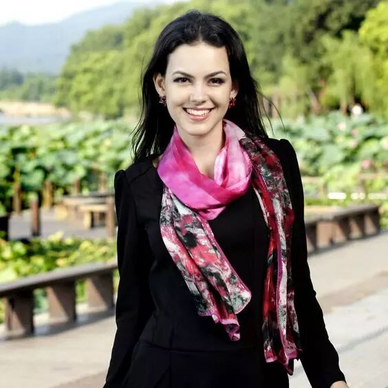 將絲巾沿對角線輕柔對折,把倒三角的部分置於胸前。在後頸處環繞後,再將兩端自然垂下於身前。將巾身整體向右移動,在身體左側打結,並將短的一段放於身後。最後調整巾身,以呈現出最佳的效果。