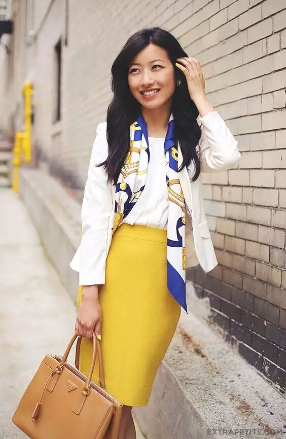 尺寸最小、經典的細長款式,有著和項鍊相似的裝飾作用,能將所有視線匯集與於胸前。適合春夏的透明質地,佐以鮮豔的色彩,給人一種溫柔可人的印象。白色襯衫是這種絲巾的最佳搭配選擇,小巧花紋與巧妙配色的組合,讓華麗感與品位兼具。