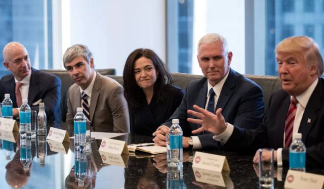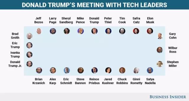 於是,本週三,川普在自己紐約的川普大廈開了一場座(鴻)談(門)會(宴),邀請了美國科技界的13位大神,包括蘋果、微軟、IBM、英特爾、Facebook、亞馬遜等公司CEO在內的多位科技大佬都來了,場面一度相當尷尬......