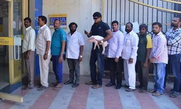 ▲印度電影明星拉維·巴布抱著一頭小豬在銀行排隊取錢。