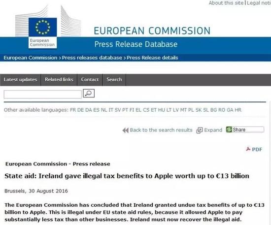 在歐盟貿易委員會官網公佈的通稿中看到,歐盟針對愛爾蘭對蘋果的稅收補貼調查早在2013年就已經啟動了。