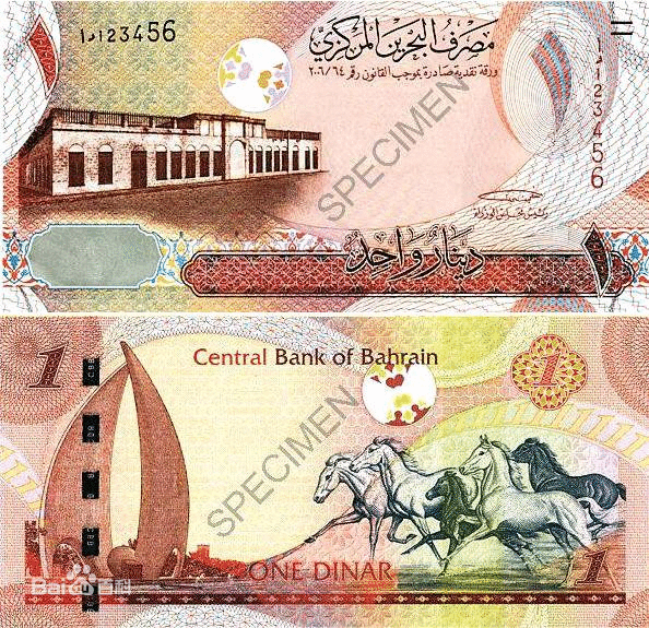 巴林第納爾(Bahrain Dinar),官方匯率為2.10美元,等於1第納爾。自1980年以來,巴林第納爾與美元的比價為1第納爾等於2.6596美元。2001年,正式與美元掛鉤。