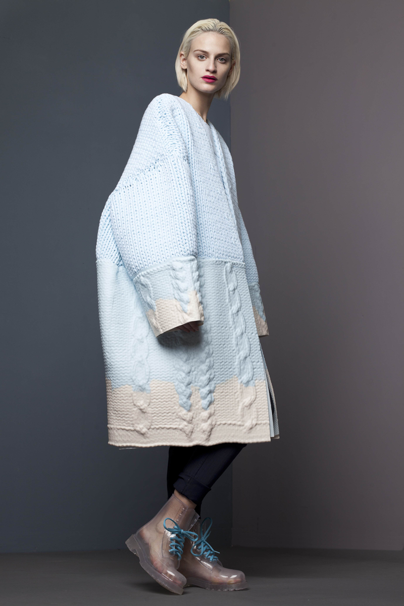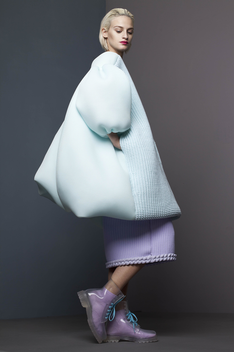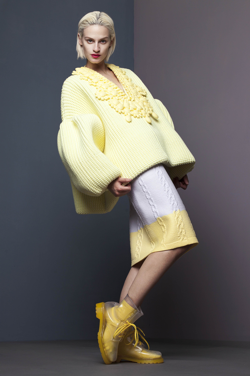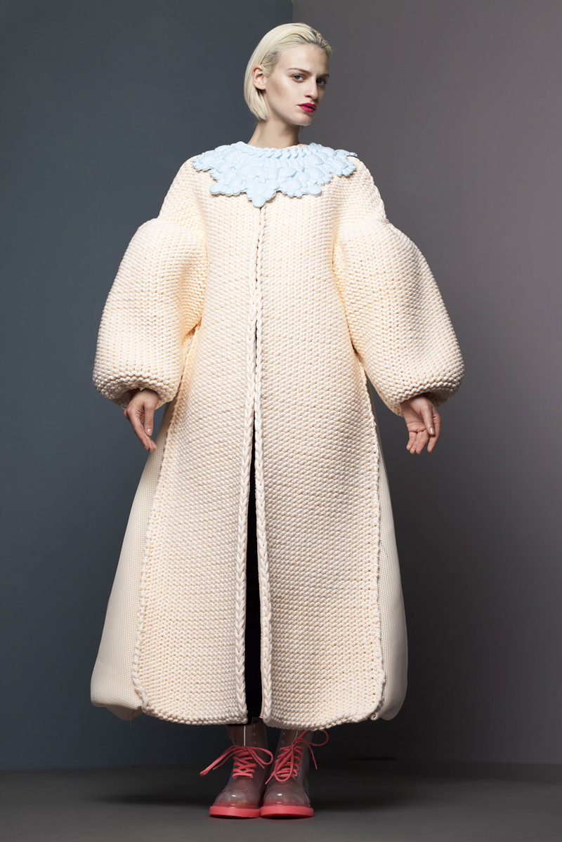 “傳統的針織品非常柔軟,沒有形狀。我希望能找到一種新的方式來呈現針織品,也受到了60年代巴黎世家和現代建築的影響。”