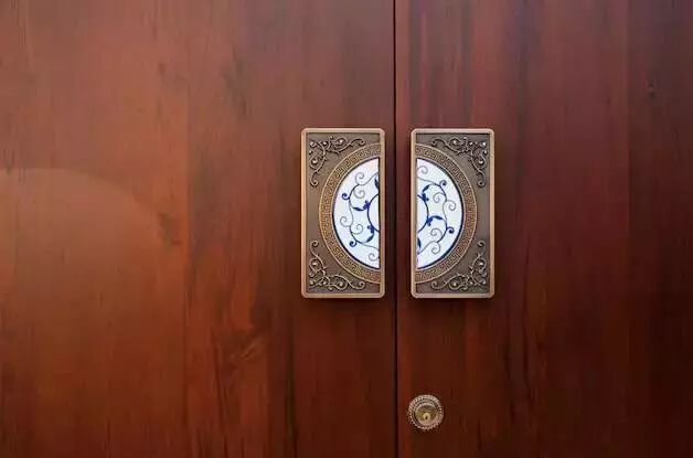 家的門是這樣的。門庭所用將軍門。據說是進口東南亞柚木外包銅邊。把手很有特色,內嵌青花瓷板。看上去很精緻。