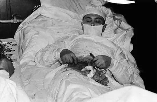 20.1961 年,劇痛下給自己做闌尾切除手術的蘇聯醫生列昂尼德·羅格佐夫。