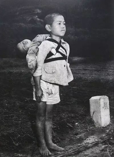 28.1945 年,長崎核爆炸後,一個把死去的弟弟背到火葬場的小男孩。