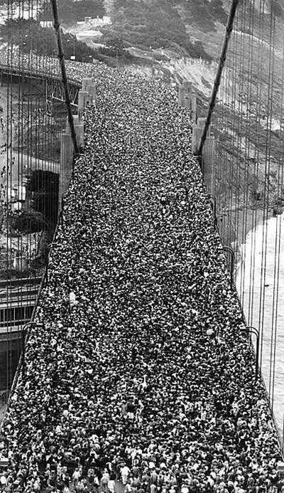 7.1987 年,慶祝金門大橋建成50 週年時大橋上的人海。
