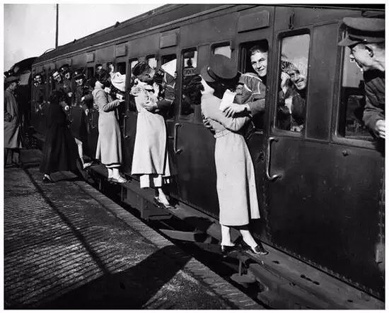 36.1935 年,從英國啟程去埃及的士兵們與愛人吻別。