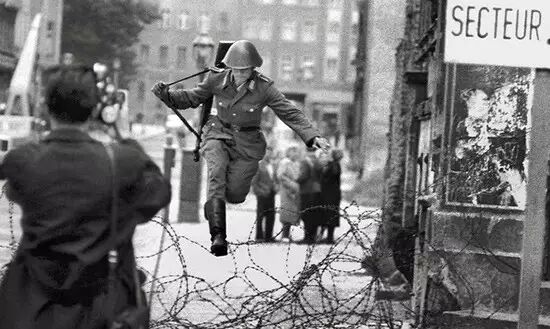 26.冷戰時期,跳過柏林牆的士兵。
