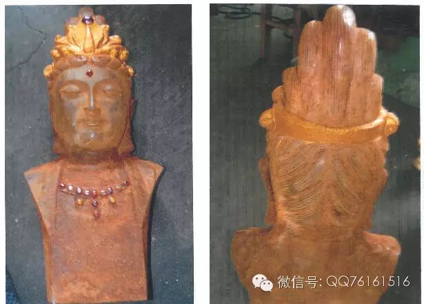二、佛像、佛頭實物 現已發現,在廣漢古蜀國佛像的載體有玉牙璋、玉璧、象牙、牛胛骨上等等。此外,在古蜀國還發現了玉巫師人,巫師是道教做法事的人,他 的服飾與佛教完全不同,在古蜀國除了佛教以外,可能還有道教存在,道、佛二教在古時可能是合一的,它們都起源於巫教,而後隨時間推移,信仰有些差異而分道揚鑣。有學者認為,西藏的苯教可能與內地的古羌釋比文化有關係,苯教是西藏本土的一種原始宗教,早於吐蕃時期“傳入”西藏的佛教存在於西藏本土之中,在苯教中存在有古羌族釋比文化的因素。(上圖為