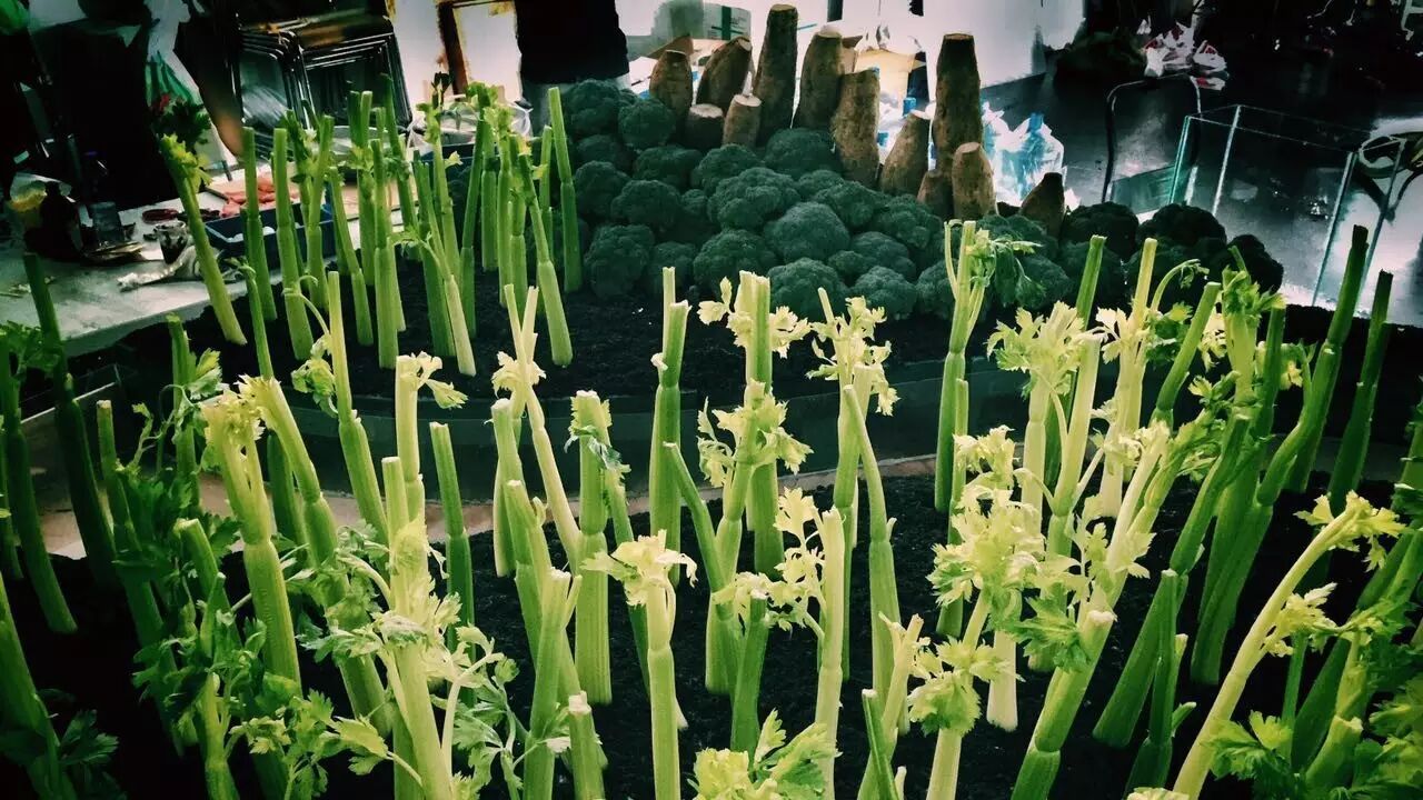 再比如用韭菜鋪成的“大草原”全景。一開始我們想著鋪上去即可,但在測試的時候,發現畫面呈現效果非常雜亂,彎曲沒有大氣之感。最後不得不辛苦團隊,按照我設計好的線條層次,一根一根疏密有致得慢慢鋪設,光鋪韭菜足足花了5個小時。