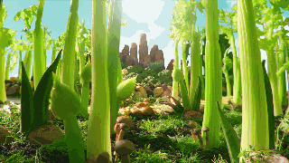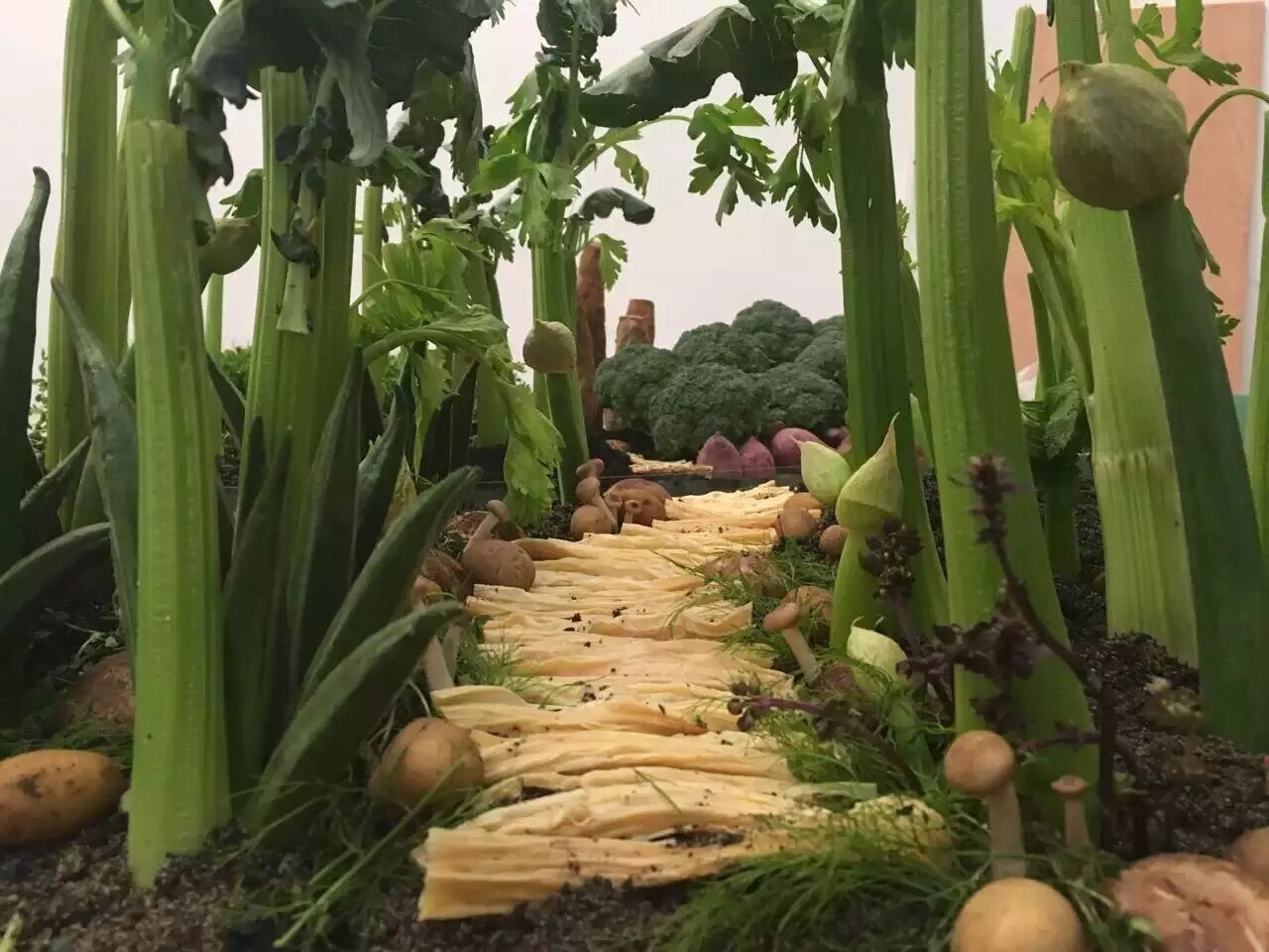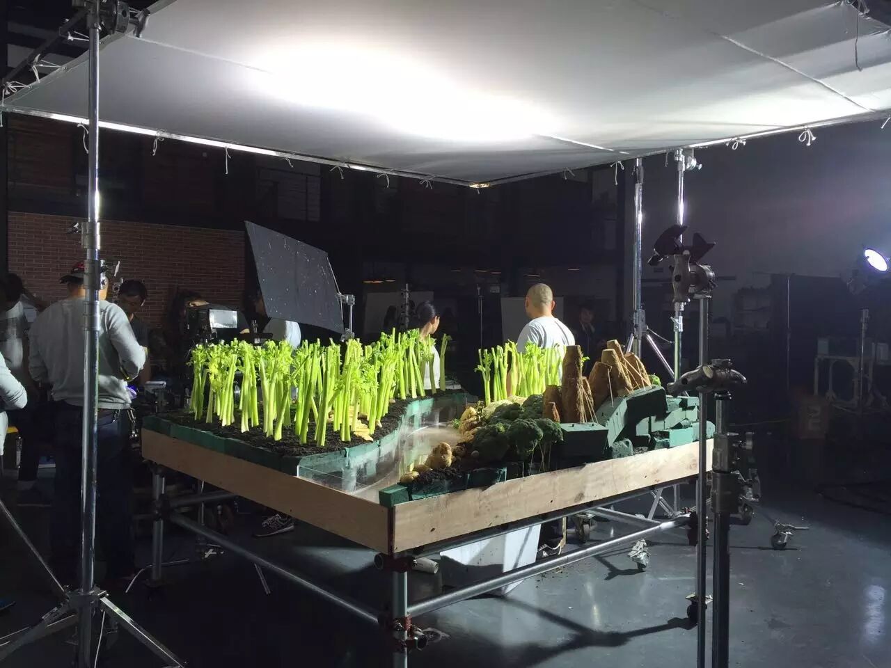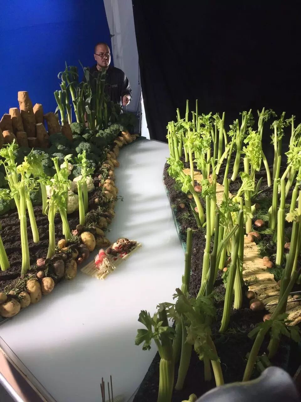 這類情況幾乎在每個場景畫面中都會或多或少的遇到,比如用肉做成的山,做太大讓人沒有食慾,做太小又體現不出肌理。叢林內部那場,芹菜等植物在燈光的照射下沒多久就全部蔫兒了,必須重換,如果拍攝幾條不過,就不得不重新再換一波等,篇幅有限就不詳細一一闡述了。