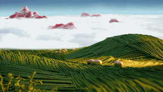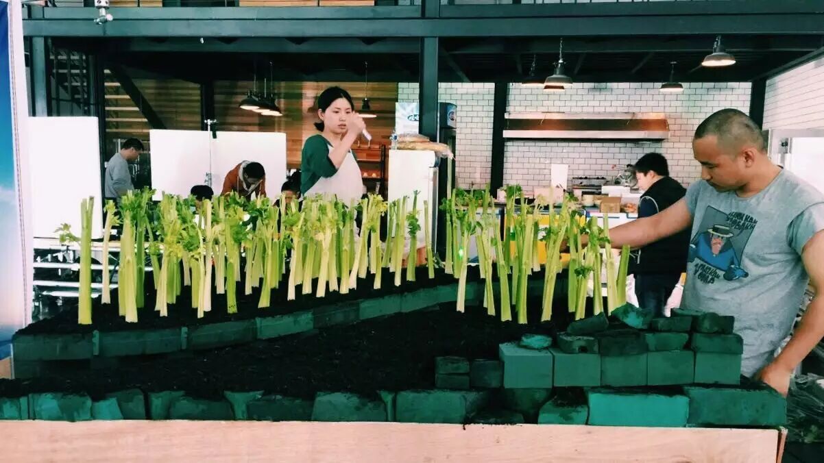 在第一個場景草原上,為了平衡前景中對草地的特寫,陳碩導演跟團隊幾經測試,最終選用豆苗這種細小的蔬菜,草原上的鮮花用黃瓜花來表現,前期設想裡真是把所有能想到的食材都在腦子裡過了一遍。後景中則選取了代表蒙古包的蘑菇和鋪滿山丘的韭菜,不同於前景中具象的豆苗,這種大面積的抽象表現形式正好契合了山水意境。