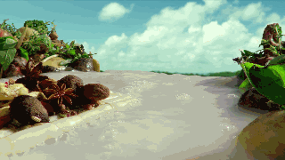 竹筏前行帶動敘事發展,充滿靈動的辣椒入水,輕輕掉落船頭的枸杞,好像在接受大自然的饋贈,以此把動態的物項與兩岸靜態的食物融合成了一體。
