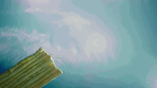陳碩導演擅長以結果為導向的敘事構建,從第一個鏡頭水珠掉落湖面,荷葉隨之蕩漾開始,動態元素的進入就打破了畫面的平靜,抓人眼球。導演依次設置了三個主場景:草原、森林和瀑布,從靜態的草原到流動的河流,先是通過水中仰拍視角給到飄在水面的竹筏剪影,故作懸念令人期待後續的更多趣味點和信息量。