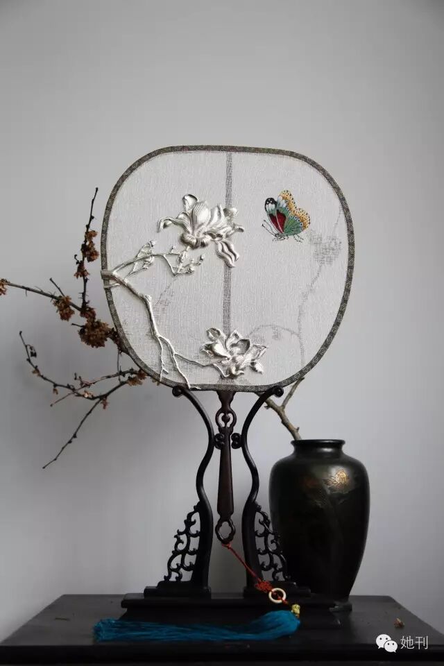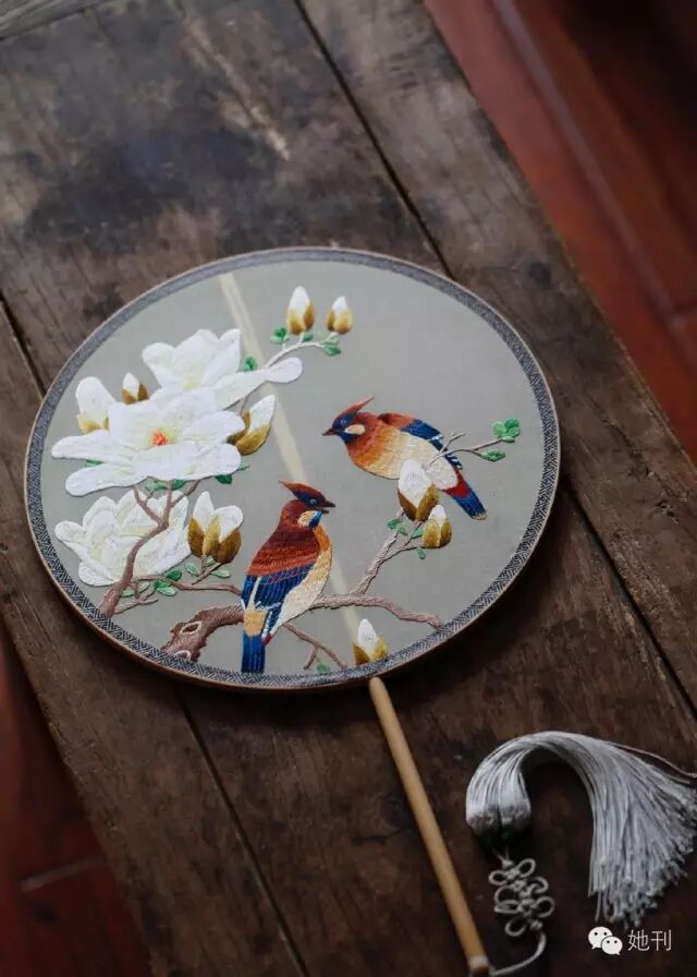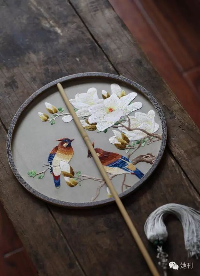 手繡玉竹柄團扇,靈感來自清代宮廷畫家餘穉所繪玉蘭圖