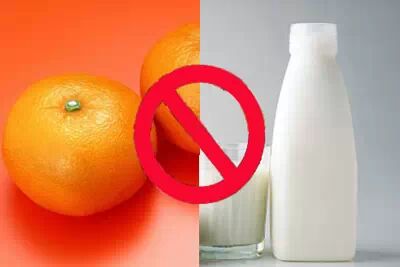 剛喝完牛奶就吃橘子,牛奶中的蛋白質就會先與橘子中的果酸和維生素c相遇而凝固成塊,影響消化吸收,而且還會使人發生腹脹、腹痛、腹瀉等症狀。