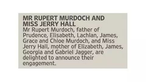 然後隔天就炸出消息:默多克在自家《泰晤士報》婚喪版刊登了訂婚公告: