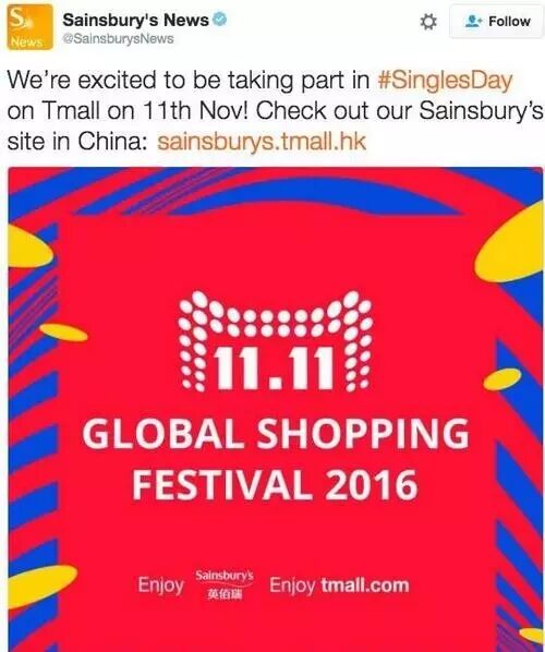 事情是這樣的,第一個公開把雙11介紹給外國群眾的,是英國第二大超市Sainsbury's——在英國呆過的人都知道,妥妥的居家旅行上學必備之寶。
