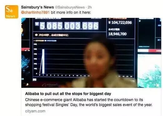 大概意思是說,中國最大的電子商務巨頭阿里巴巴正在為全球最大的購物節(光棍節)倒計時!