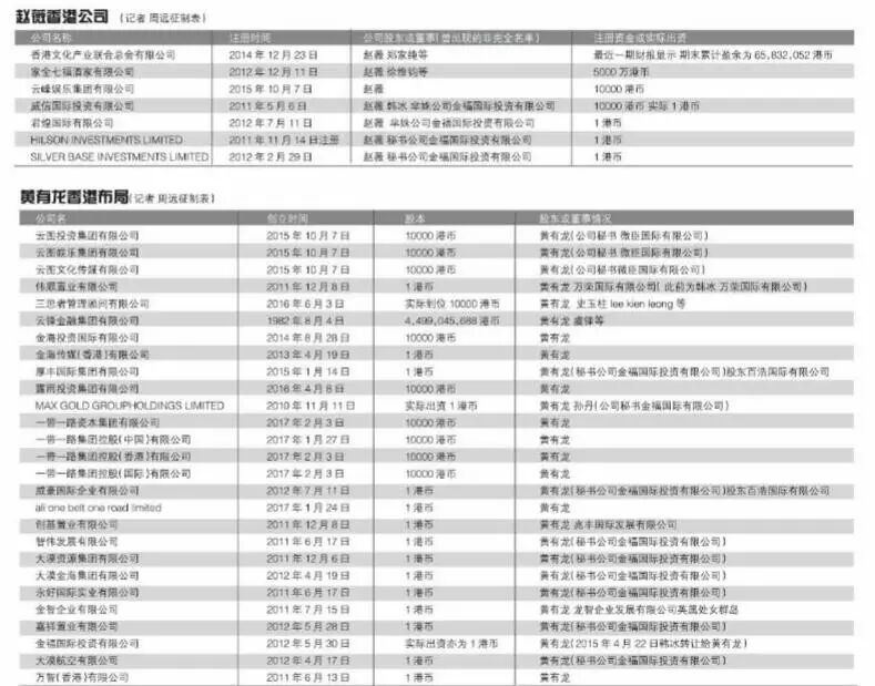 正如數月來風口浪尖中出現的西藏龍薇文化傳媒有限公司,名字中包含黃有龍的“龍”,以及趙薇的“薇”之外,黃有龍和趙薇雙線並行分別在香港註冊設立了一串“龍系列”和“薇系列”公司。