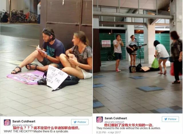 照片中的幾個西方遊客在新加坡街邊賣藝、售賣明信片,其目的是籌錢實現自己環球旅行的夢想。