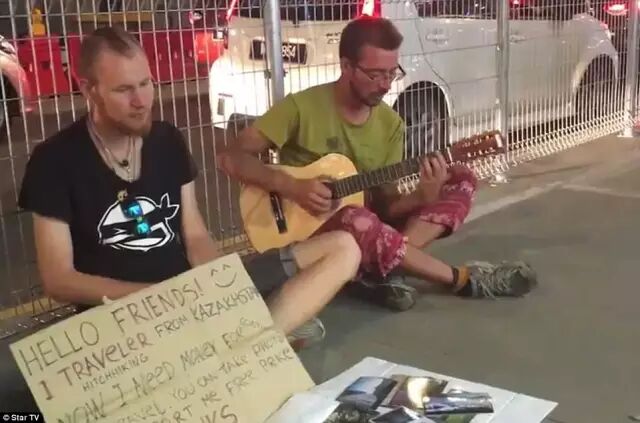 The first pair are sitting on the ground behind a cardboard sign that says " Support our trip around the world ”, and are peddling postcards. Other photos show a different young couple playing Pink Floyd and Guns 'N' Roses songs on the guitar and harmonica next to a cardboard sign with the same message.第一對席地而坐,面前擺著一個紙板,上面寫著“ 支持我們的環球旅行 ”,同時兜售著一些明信片。其他照片中顯示一對小年輕彈著吉他、吹著口琴,表演平克·弗洛伊德和槍砲玫瑰的歌曲,旁邊的紙板上寫著同樣的信息。