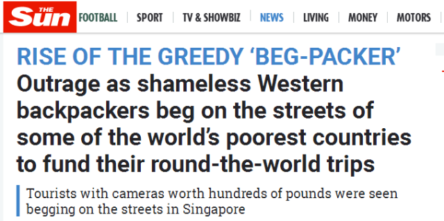 貪得無厭的“乞討客”群體日漸壯大:一些厚顏無恥的西方背包客在世界上最窮的一些國家乞討,求別人資助其環球旅行,真是令人憤怒。一些背著價值數百英鎊照相機的遊客在新加坡街頭乞討。